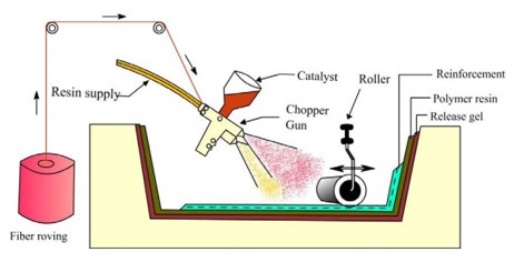 آماده سازی قالب – مخلوط کردن رزین و کاتالیزور – خرد کردن الیاف تقویت کننده درون تفنگ – اسپری کردن روی قالب – یکپارچه سازی – پخت – پیرایش نهایی